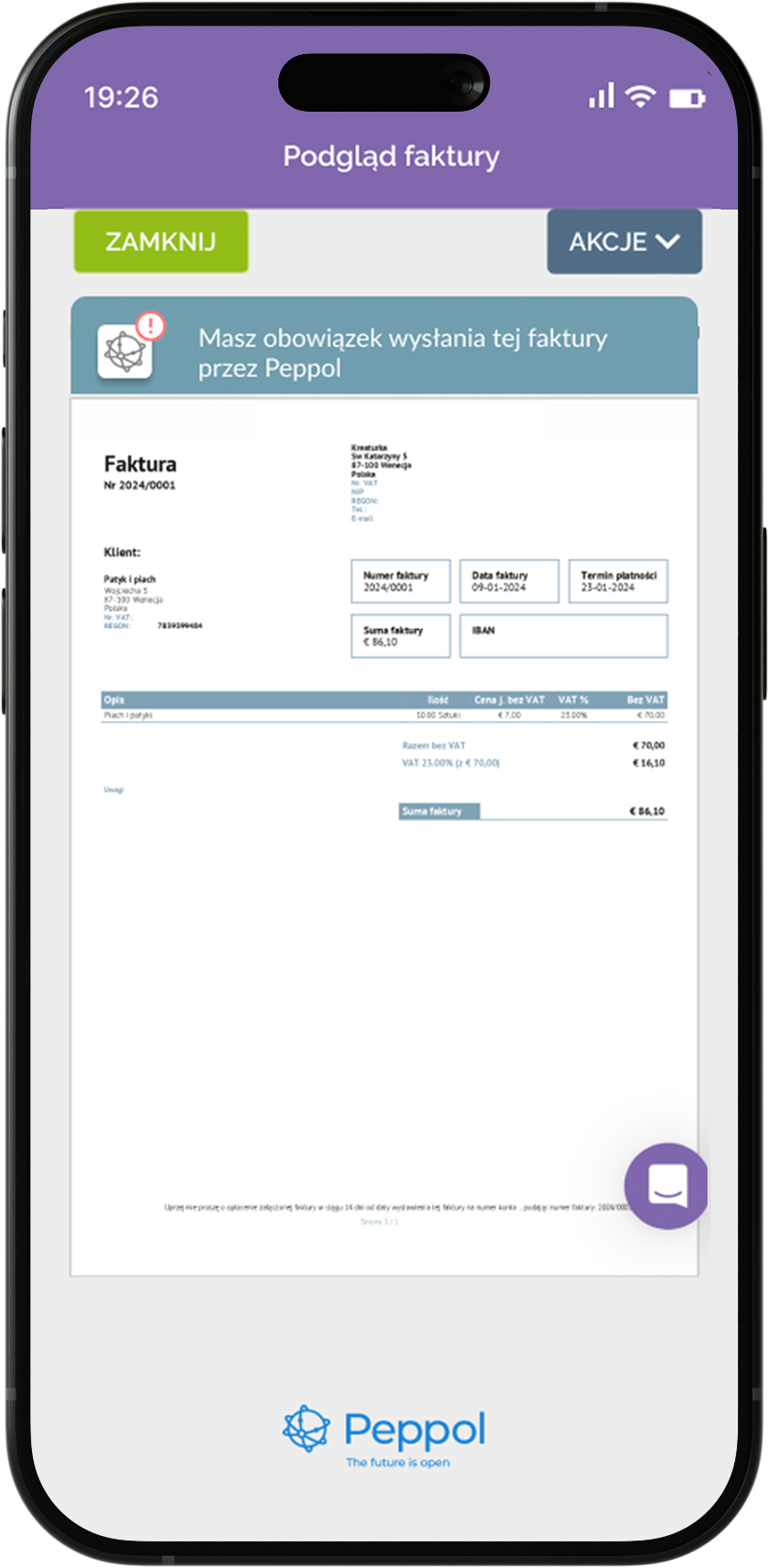 System sam rozpozna, czy klient spełnia warunki do wysyłki przez Peppol, a Ty otrzymasz powiadomienie na ekranie aplikacji.