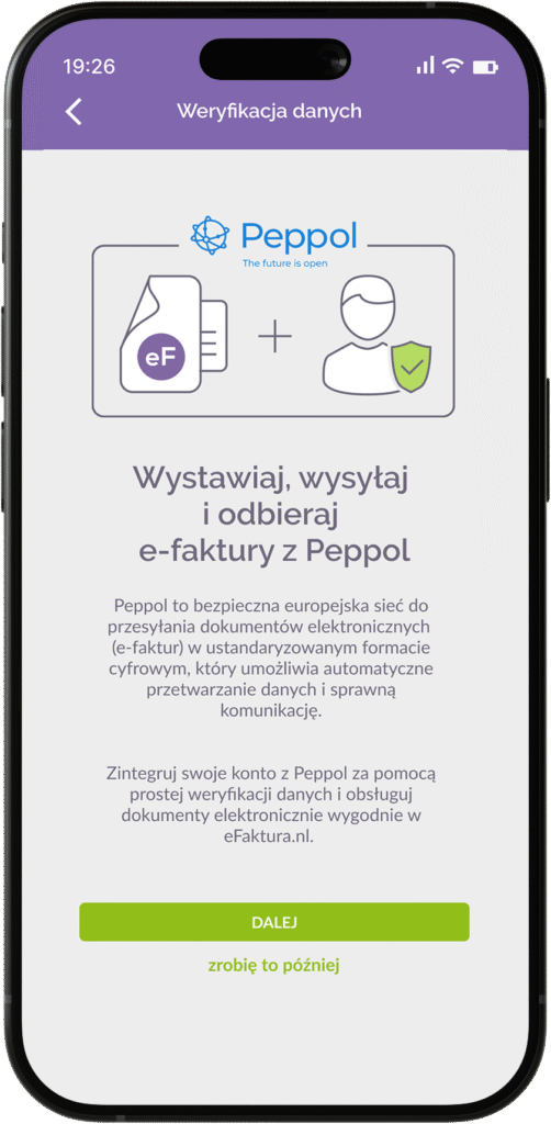 Całość weryfikacji odbywa się online, trwa kilka minut i jest przeprowadzana przez zewnętrznego, certyfikowanego partnera Peppol. Dane przekazywane w tym procesie są bezpieczne i nie są przechowywane przez eFaktura.nl.